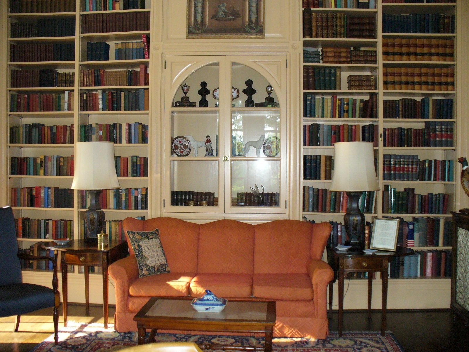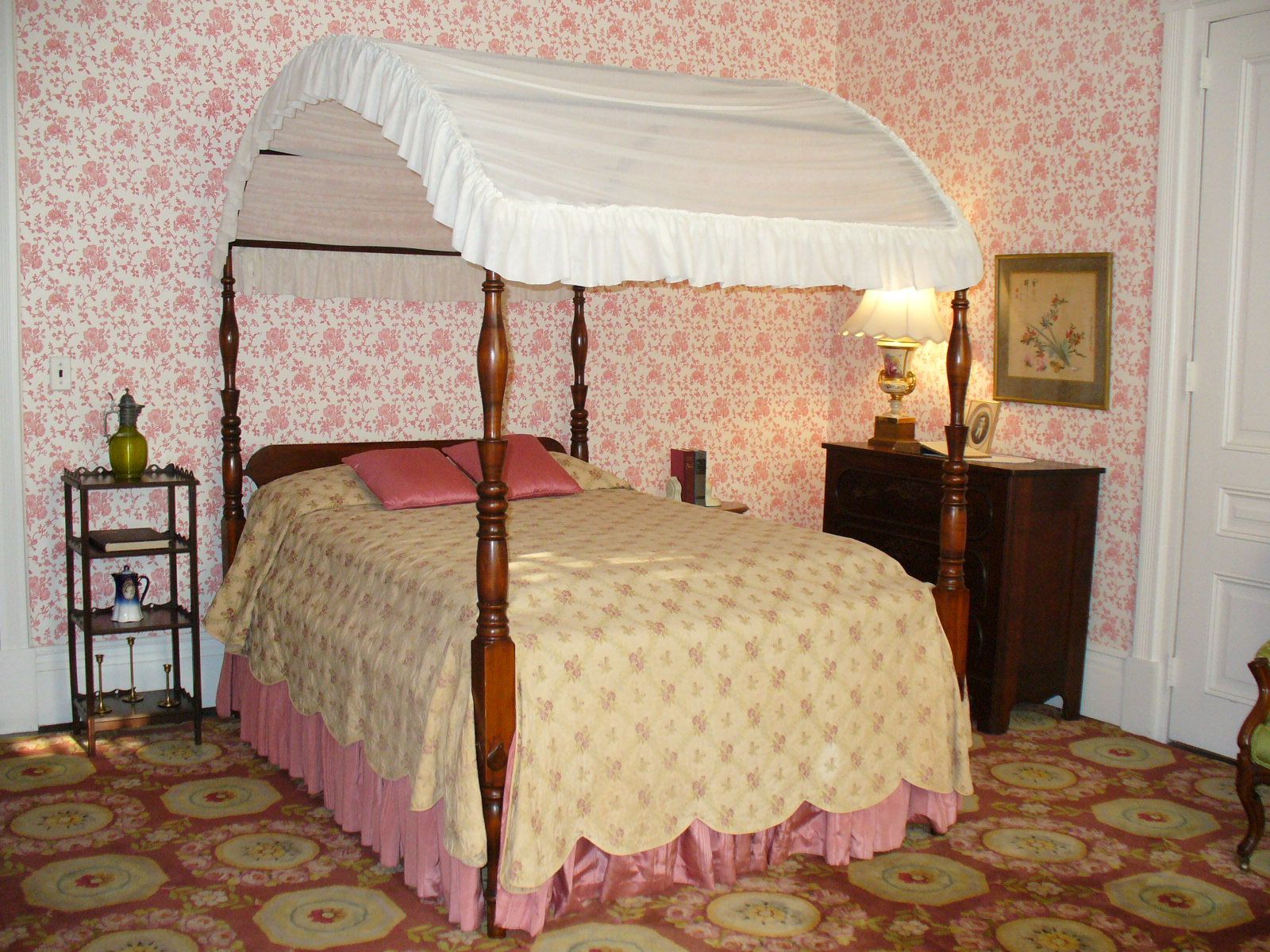 The eclectically furnished interior features pieces dating from the late 18th century up until the mid-20th. Many original pieces, such as the Governor’s carved mahogany bed, were rescued from storage in the servants house and restored by Emily Tichenor. Part of the charm of the house is that, unlike many house museums, it remained occupied by the same family until just over a decade ago.